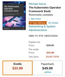 As of today, I am officially a published author. My first book, The Kubernetes Operator Framework Book, is now available from Amazon and Packt (in both print and ebook).